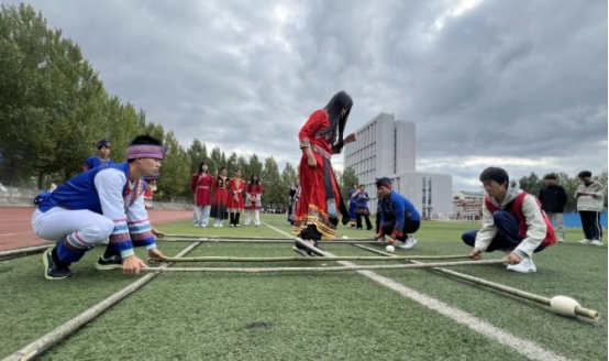 竹竿舞区域,少数民族同学为汉族同学示范竹竿舞的步伐,赛场内外满是团结友爱的温馨画面。伴随着清脆的竹竿敲击声,同学们默契配合,踏出欢快节奏。