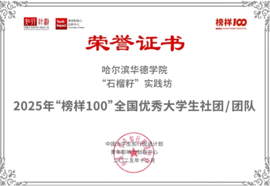 近日,中国大学生知行促进计划、青年影响力创新中心联合发布2025年“榜样100”全国优秀大学生社团及团队榜单,哈尔滨华德学院“石榴籽”实践坊在全国376所高校1320支参评团队的激烈角逐中脱颖而出,成功入围全国优秀大学生社团行列。