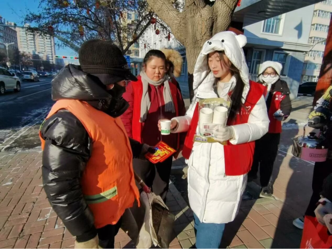 汽车与建筑工程学院高玮同学在齐齐哈尔甘南县零下二十摄氏度清晨,为环卫工人送上热姜茶,还担当乡村小学临时讲师为孩子们拓宽视野,同时走进社区陪伴老人、带领儿童做手工,在“赠人玫瑰,手有余香”的实践中读懂了奉献的内涵。
