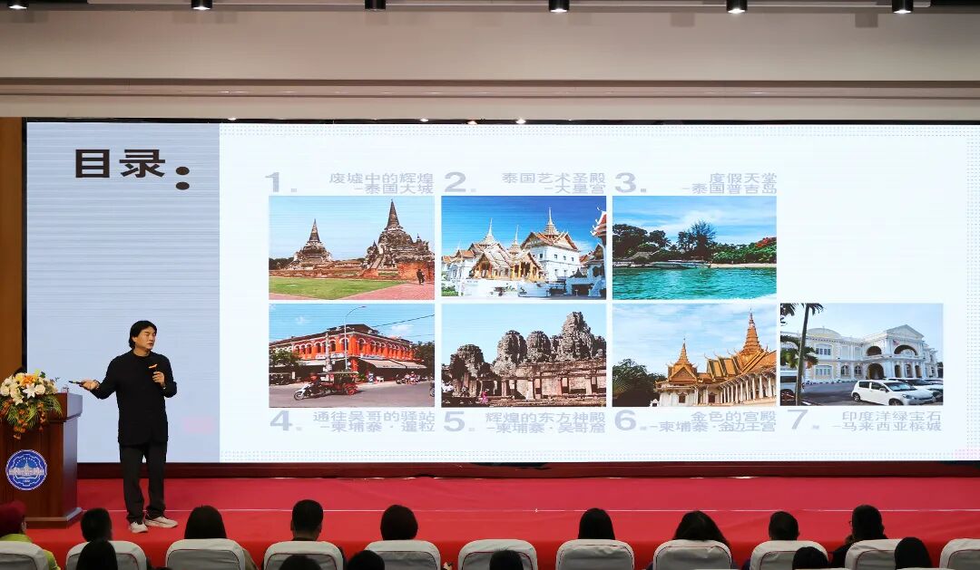 讲座中,张红松教授以“行走”为序、以“写生”为笔,用多年积累的建筑写生作品和调查影像,带领师生走进东南亚建筑的独特世界。从地域风情的细腻捕捉,到文化底蕴的层层深挖;从物像观察、心像感悟,到意像升华、图像呈现,张教授以其行者之思与笔墨之韵,将建筑艺术与写生创作的内在联系娓娓道来。他强调,艺术创作始于观察、源于感悟、成于表达、归于文化,唯有用心去丈量、用脚步去行走,方能真正捕捉建筑的灵魂。讲座既有理论高度,又有实践温度,赢得了师生阵阵热烈掌声。