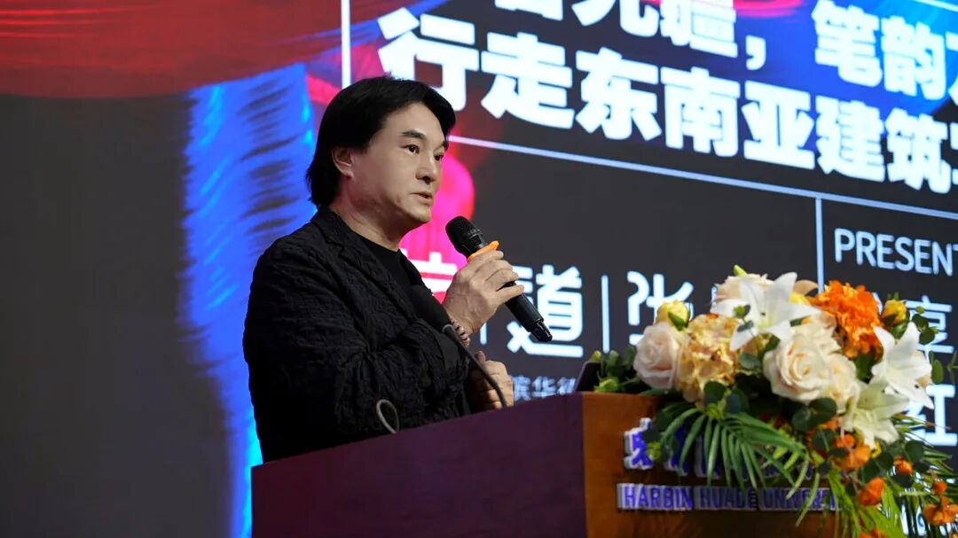 4月9日,哈尔滨华德学院学术报告厅内座无虚席,艺术与传媒学院第十期“艺道华德”学术讲座如约开讲。艺术与传媒学院名誉院长、设计学科带头人、博士生导师张红松教授以《行者无疆,笔韵万象——行走东南亚建筑写生之旅》为题,为学校师生带来一场跨越山海的跨文化艺术对话。艺术与传媒学院副院长范薇(主持工作)担任本次讲座主持,副院长徐珊珊、学生发展中心主任王亮、学院全体教师、学生代表400余人参加。