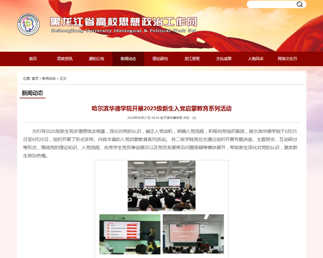【黑龙江省高校思想政治工作网】哈尔滨华德学院开展2025级新生入党启蒙教育系列活动