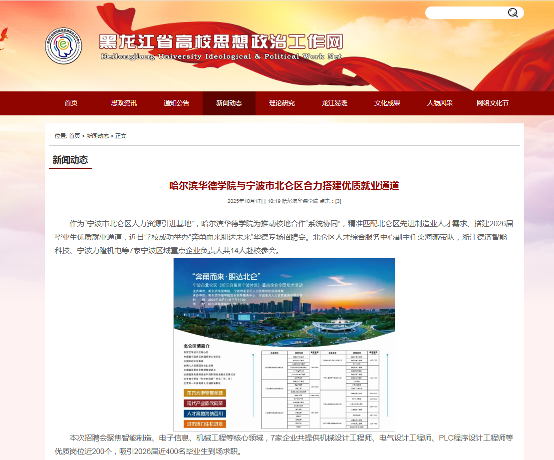 【黑龙江省高校思想政治工作网】哈尔滨华德学院与宁波市北仑区合力搭建优质就业通道