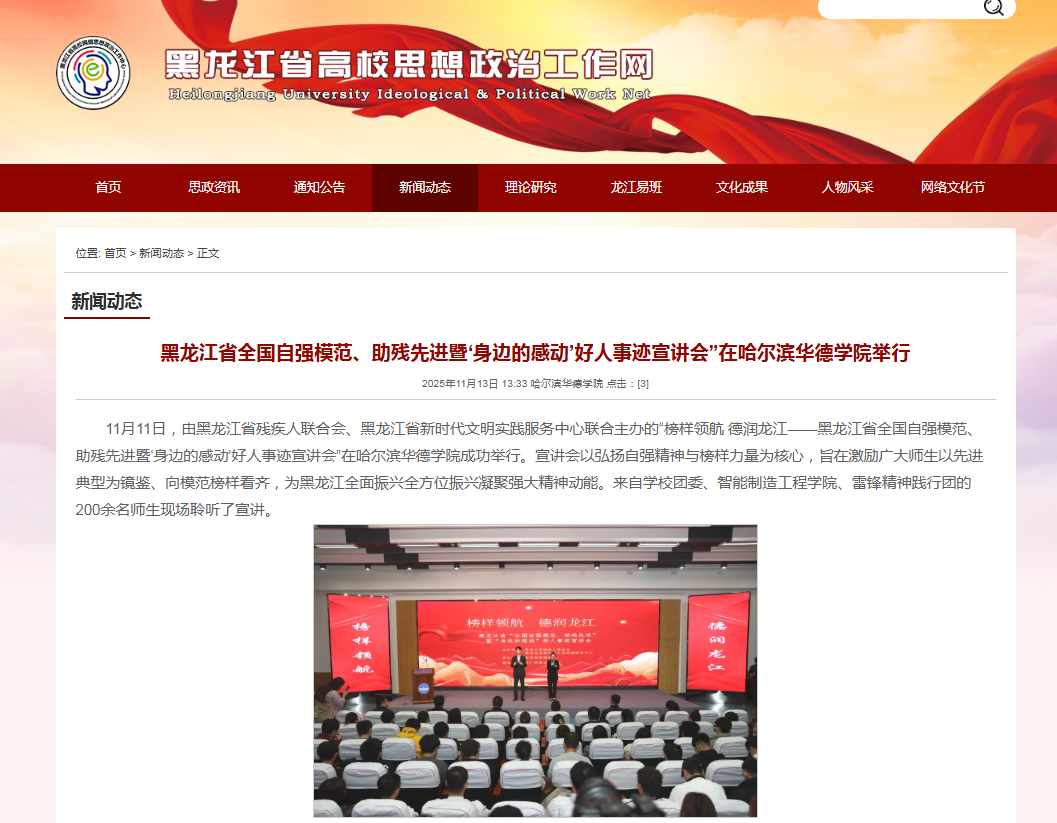 【黑龙江省高校思想政治工作网】黑龙江省全国自强模范、助残先进暨‘身边的感动’好人事迹宣讲会”在哈尔滨华德学院举行