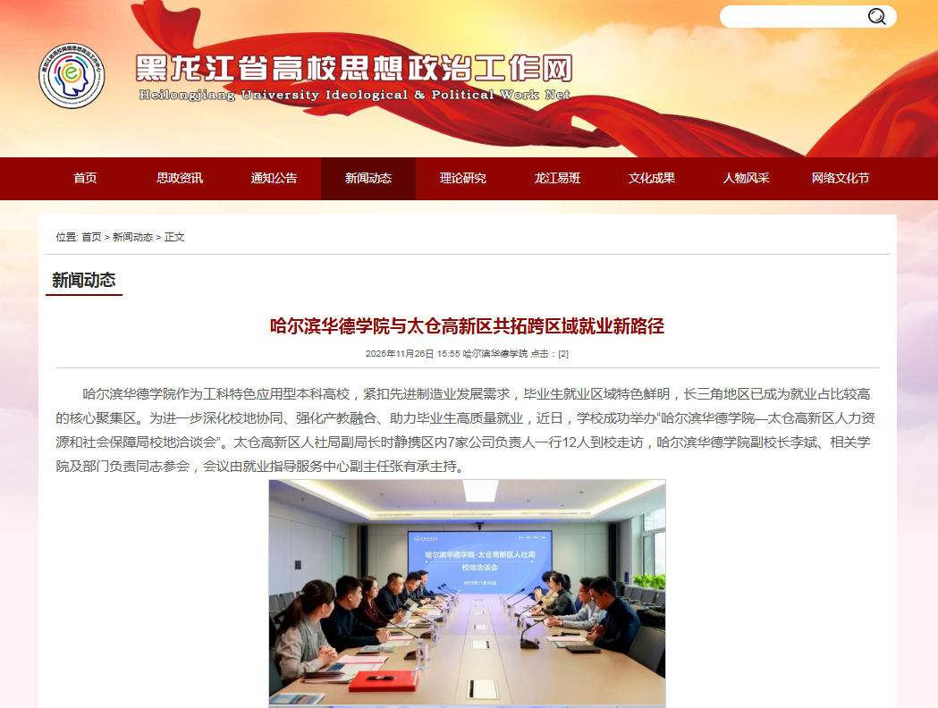 【黑龙江省高校思想政治工作网】哈尔滨华德学院与太仓高新区共拓跨区域就业新路径