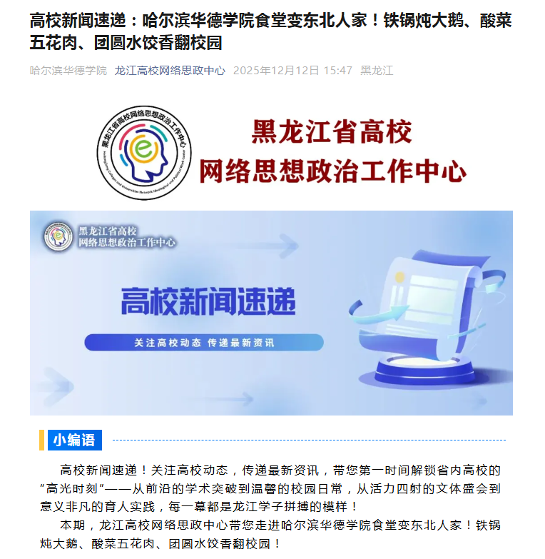 【龙江高校网络思政中心】哈尔滨华德学院食堂变东北人家!铁锅炖大鹅、酸菜五花肉、团圆水饺香翻校园