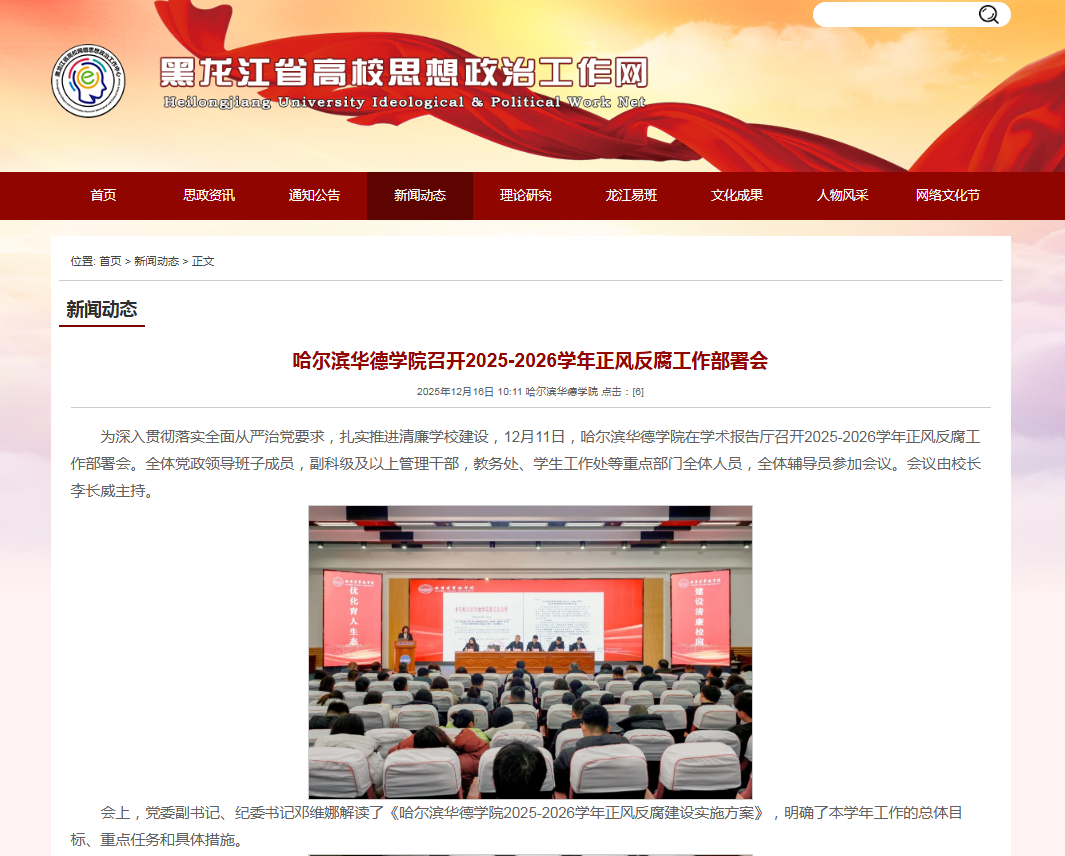 【黑龙江省高校思想政治工作网】哈尔滨华德学院召开2025-2026学年正风反腐工作部署会