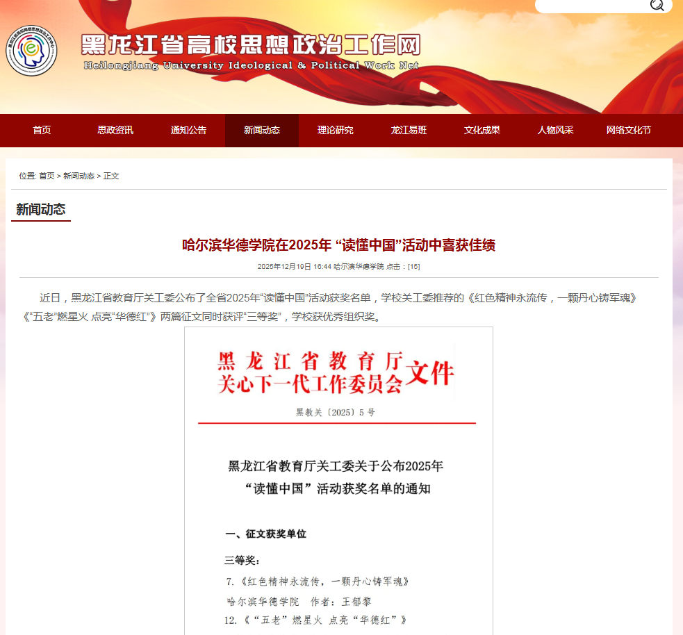 【黑龙江省高校思想政治工作网】哈尔滨华德学院在2025年 “读懂中国”活动中喜获佳绩