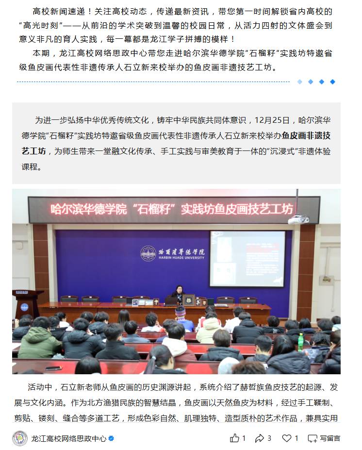 【龙江高校网络思政中心】非遗文化进校园 | 赫哲族鱼皮制作技艺亮相哈尔滨华德学院