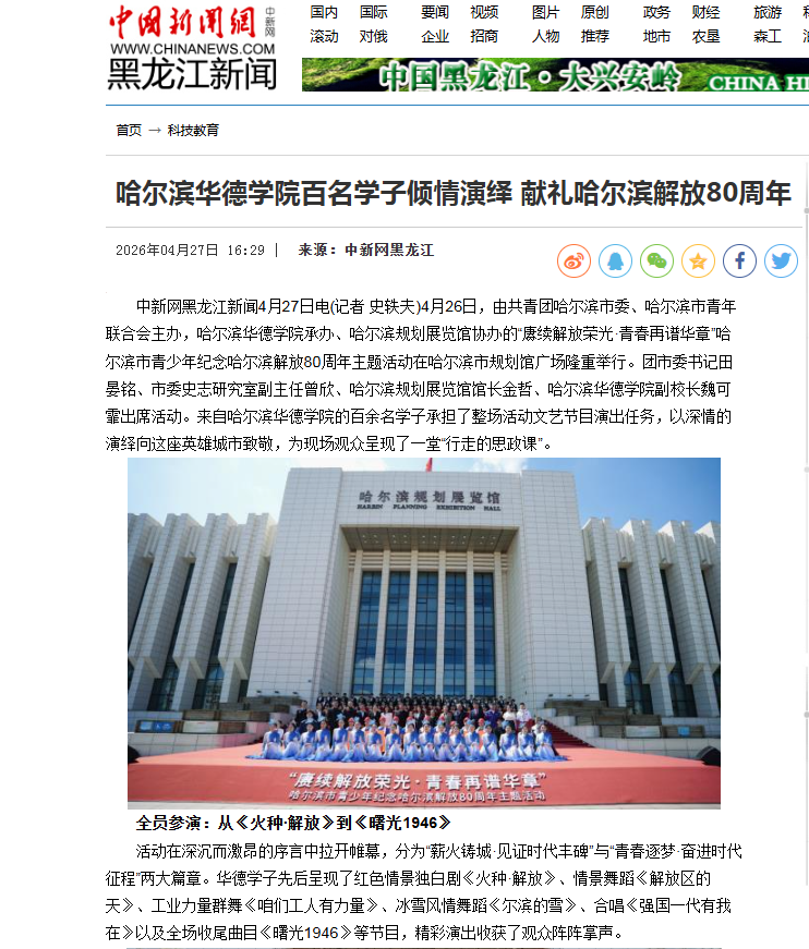 【中国新闻网】哈尔滨华德学院百名学子倾情演绎 献礼哈尔滨解放80周年
