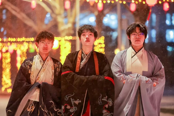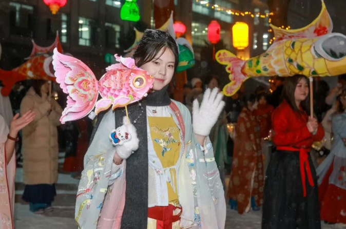 花灯巡游现场,光影流转,人潮涌动。由各学院代表组成的古风巡游队伍惊艳亮相,他们衣袂飘飘,英姿飒爽,仿佛从画中走来。